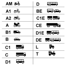 - B: El “carné de coche” que todos conocemos. Para automóviles cuya MMA (masa máxima autorizada) no exceda los 3.500kg y que estén diseñados para el transporte de no más de 8 pasajeros, además del conductor.